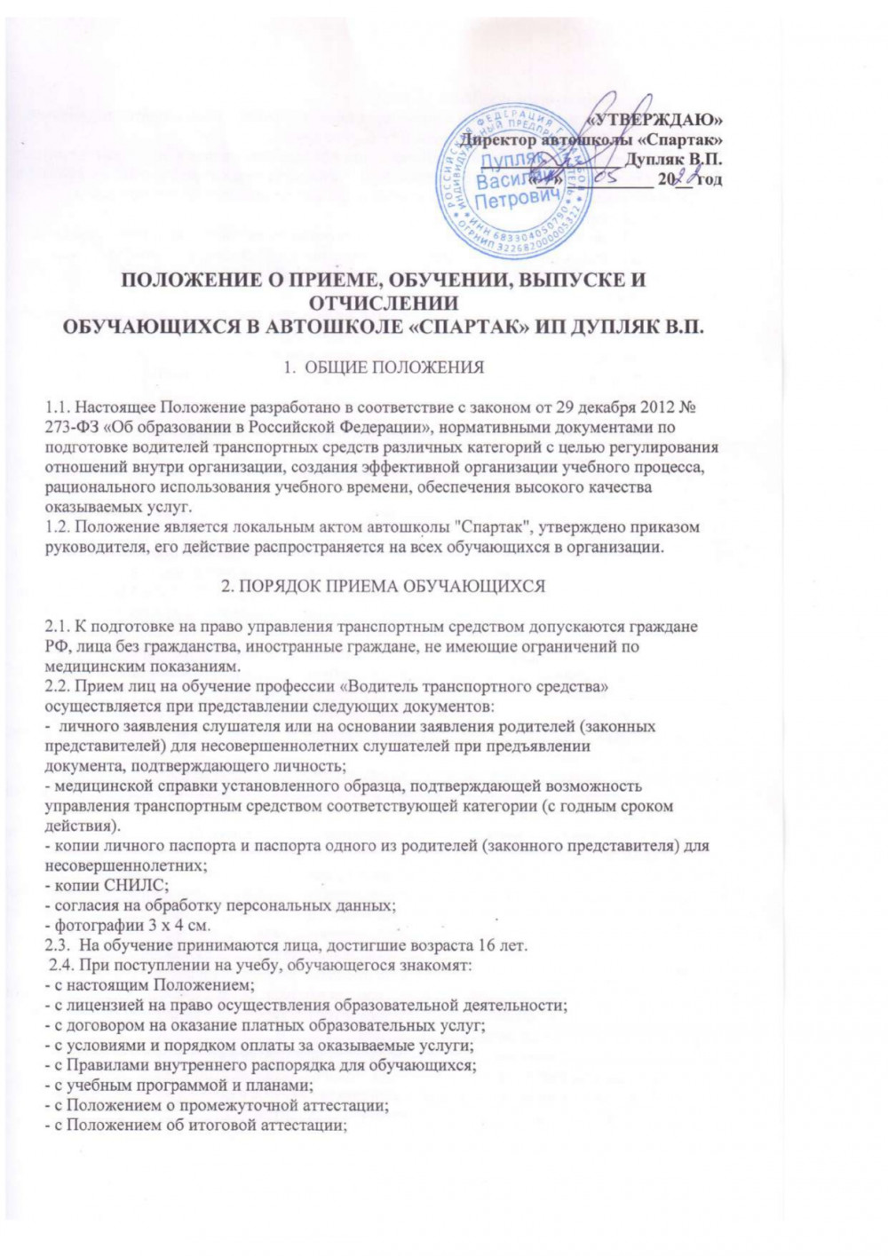 Положение о приеме, обучении, выпуске и отчислении обучающихся